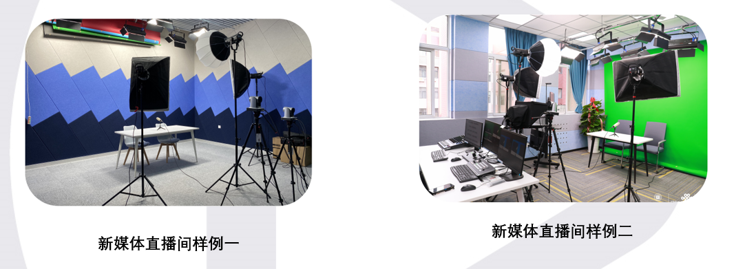 新媒体直播间是以好莱坞绿幕特效技术为基础,设备高度集成化,结合最新直播技术打造的 5G 多功能融合直播间。通过专业化设备,降低内容生产成本、提高内容生产与传播效率,可应用于广电级视频拍摄处理、超高清多机位式直播开播。